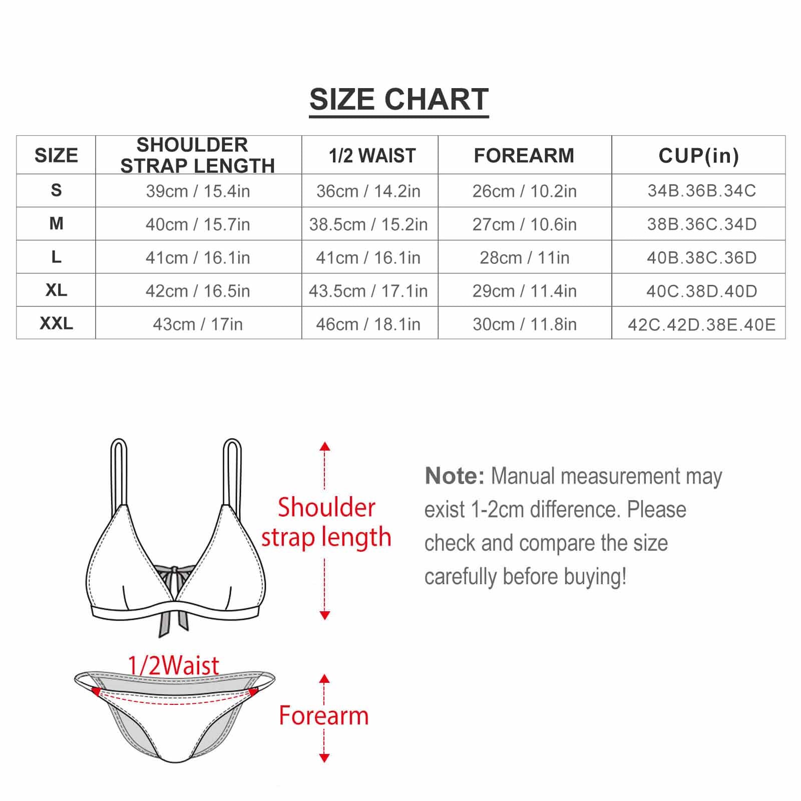 | Talla | Coreea(cm/in) | Cintura(cm/in) | Longitud de abajo(cm/in) | Cup(in) |