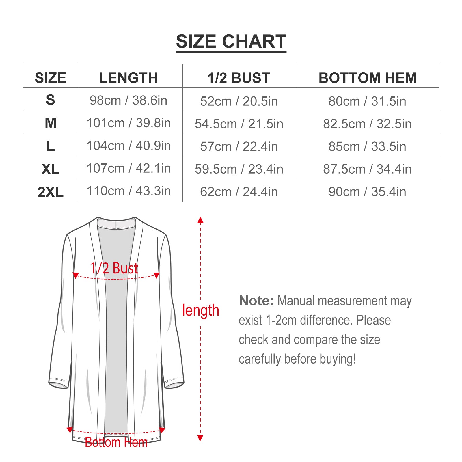 | Talla | Longitud(cm/in) | 1/2Busto(cm/in) | Dobladillo(cm/in) |