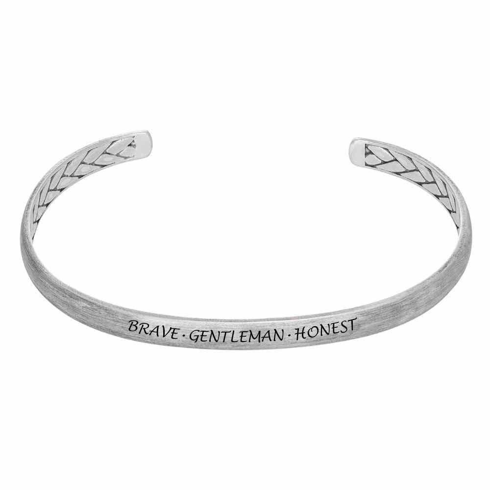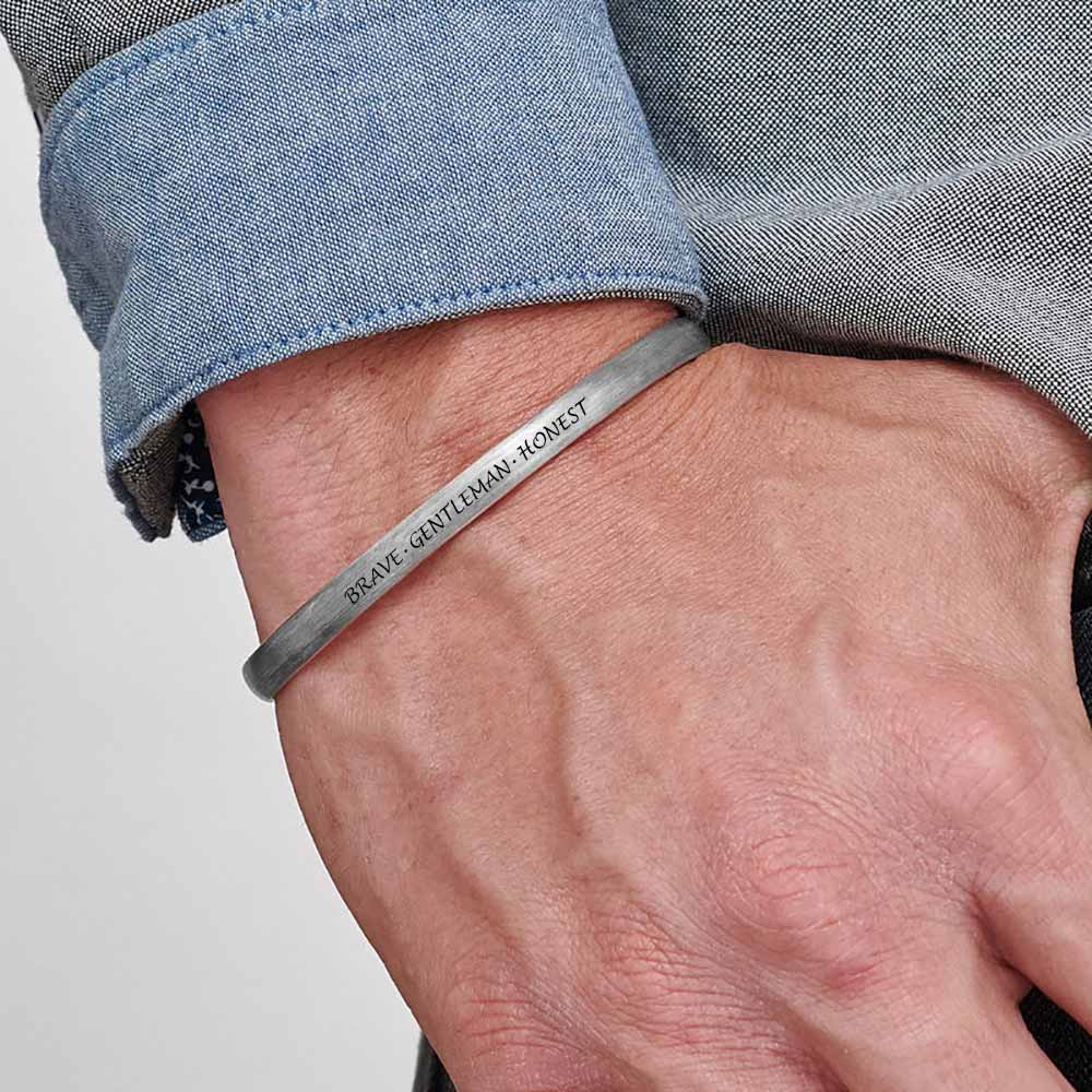 Nuestro Brazalete Grabado / Pulsera de Plata / Cobre para Hombre S0033 produce una impresión visual impresionante al mismo tiempo que brinda un ajuste cómodo y seguro. Esta hermosa pieza presenta una banda delgada con extremos ligeramente redondeados. Cada lado tiene espacio para una inscripción de su elección, por lo que la pieza terminada tiene un significado especial. Esta pulsera está hecha con Plata de Ley / Cobre.