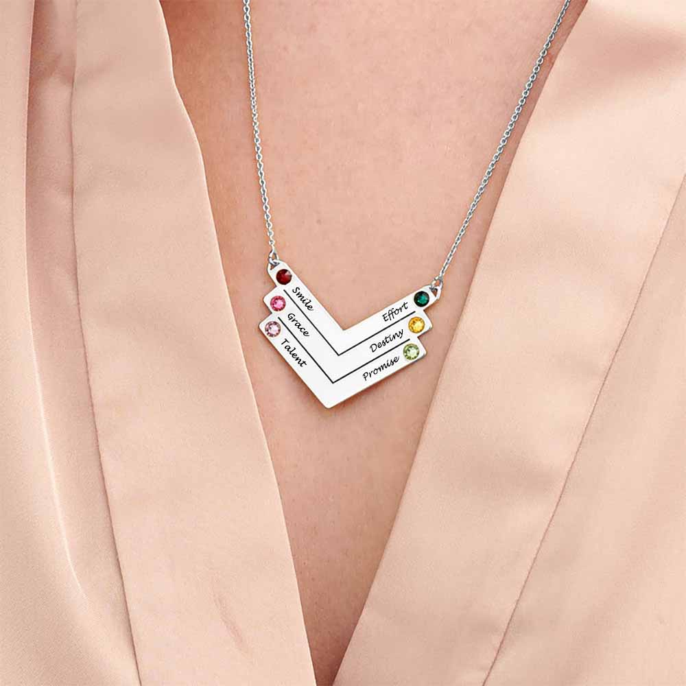 Nuestra Cadena con colgante rectangular de ángulo recto forma en V piedra natal Longitud Ajustable en plata de ley 925 chapado de oro rosa de 18K para mujer hombre X0031 Personalizado con texto nombre combina varias tendencias en una joya extremadamente versátil. Primero, elija hasta seis nombres, que estarán bellamente grabados en una escritura tradicional. Nuestros artesanos se encargan del resto, presentando el colgante terminado en una cadena a juego, que se une a cada extremo para lograr un hermoso aspecto equilibrado. Este collar está hecho de plata de ley o cobre y presenta: