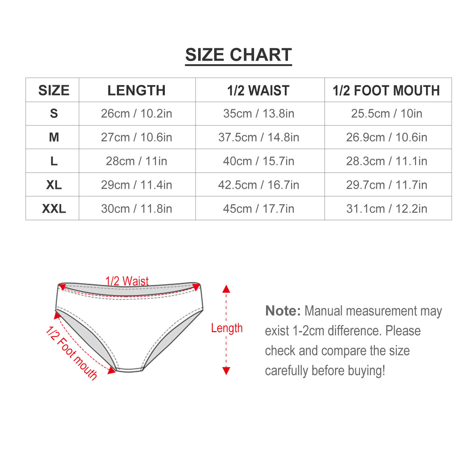 | Talla | Longitud(cm/in) | 1/2Cintura(cm/in) | 1/2Pernera(cm/in) |