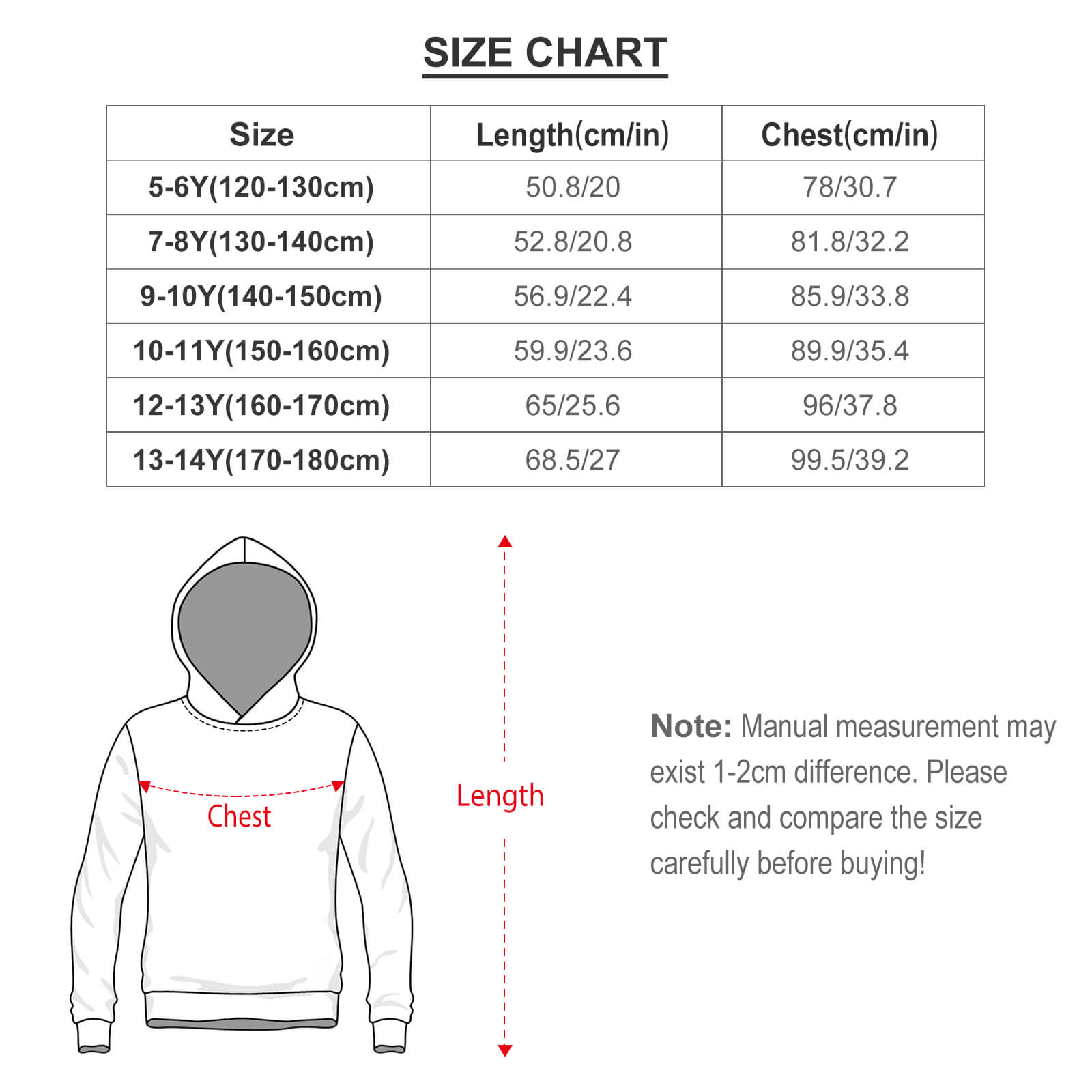 Nota especial: Las tallas de estos productos se refieren a las tallas europeas. Si tiene alguna pregunta, comuníquese con el servicio al cliente para una consulta. Estos datos de talla se miden en el estado desplegado. Debido a los diferentes métodos de medición, el error dentro de 1-2cm es un fenómeno normal. No utilice el mismo color que el de fondo de la ropa para las imágenes de diseño, causará la incapacidad de tinta durante la producción y los problemas anteriores son normales, no se incluirá en el alcance del tratamiento postventa.