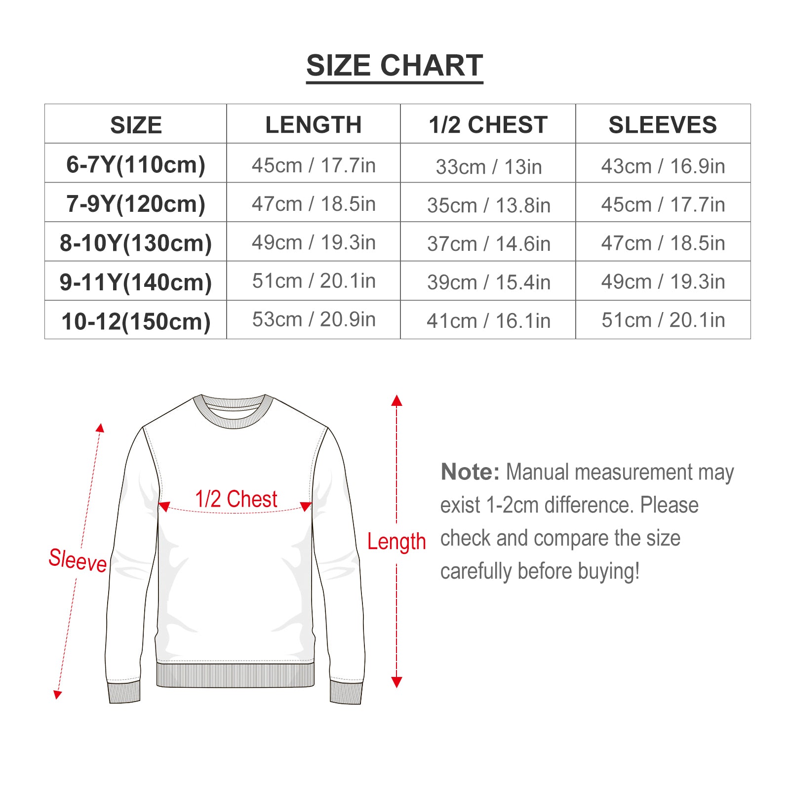 Nota especial: Estos datos de talla se miden en el estado desplegado. Debido a los diferentes métodos de medición, el error dentro de 2-4cm es un fenómeno normal. No utilice el mismo color que el de fondo de la ropa para las imágenes de diseño, causará la incapacidad de tinta durante la producción y los problemas anteriores son normales, no se incluirá en el alcance del tratamiento postventa.