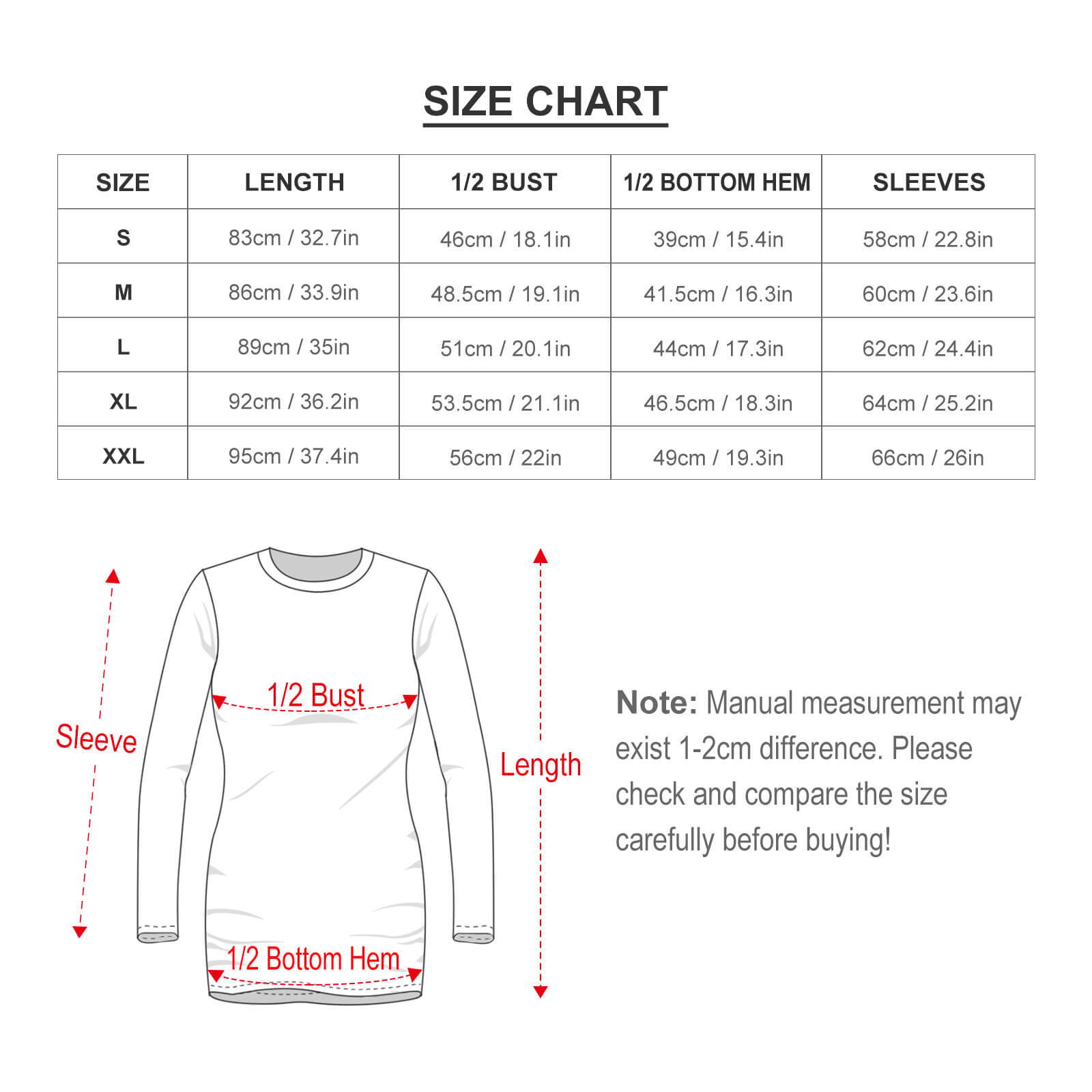Nota especial: Las tallas de estos productos se refieren a las tallas europeas. Si tiene alguna pregunta, comuníquese con el servicio al cliente para una consulta. Estos datos de talla se miden en el estado desplegado. Debido a los diferentes métodos de medición, el error dentro de 1-2cm es un fenómeno normal. No utilice el mismo color que el de fondo de la ropa para las imágenes de diseño, causará la incapacidad de tinta durante la producción y los problemas anteriores son normales, no se incluirá en el alcance del tratamiento postventa.