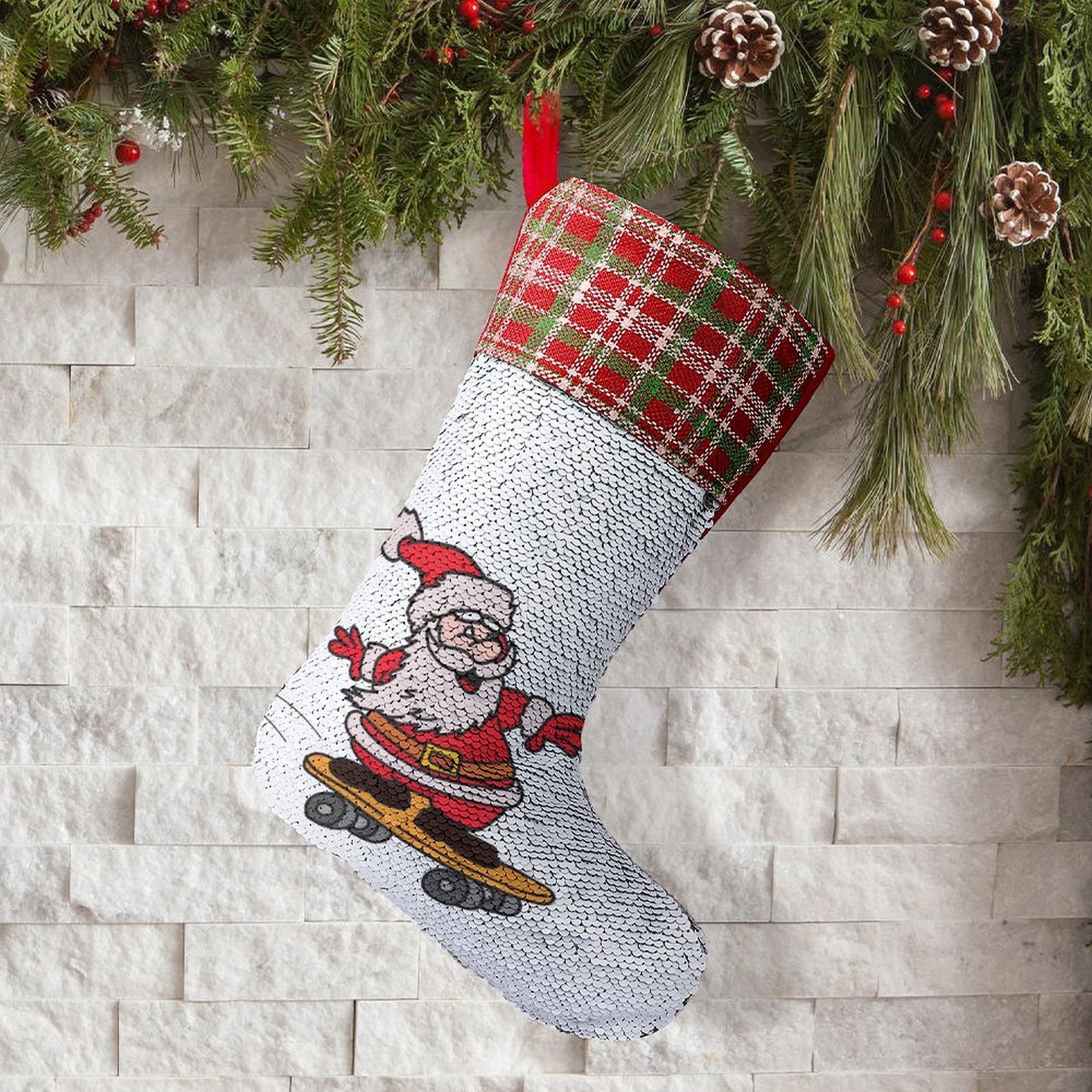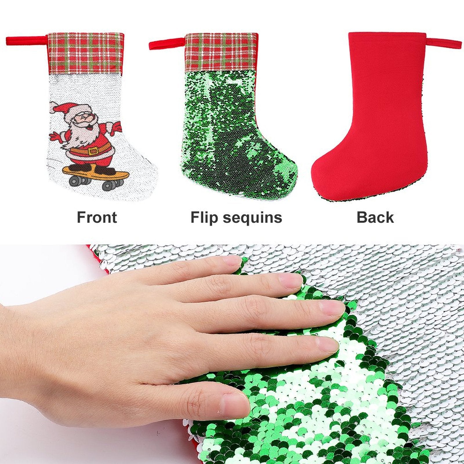 El suave y robusto respaldo de fieltro de color rojo o verde proporciona un contraste clásico y una durabilidad que asegura que este calcetín mágico formará parte de tus tradiciones navideñas durante años.