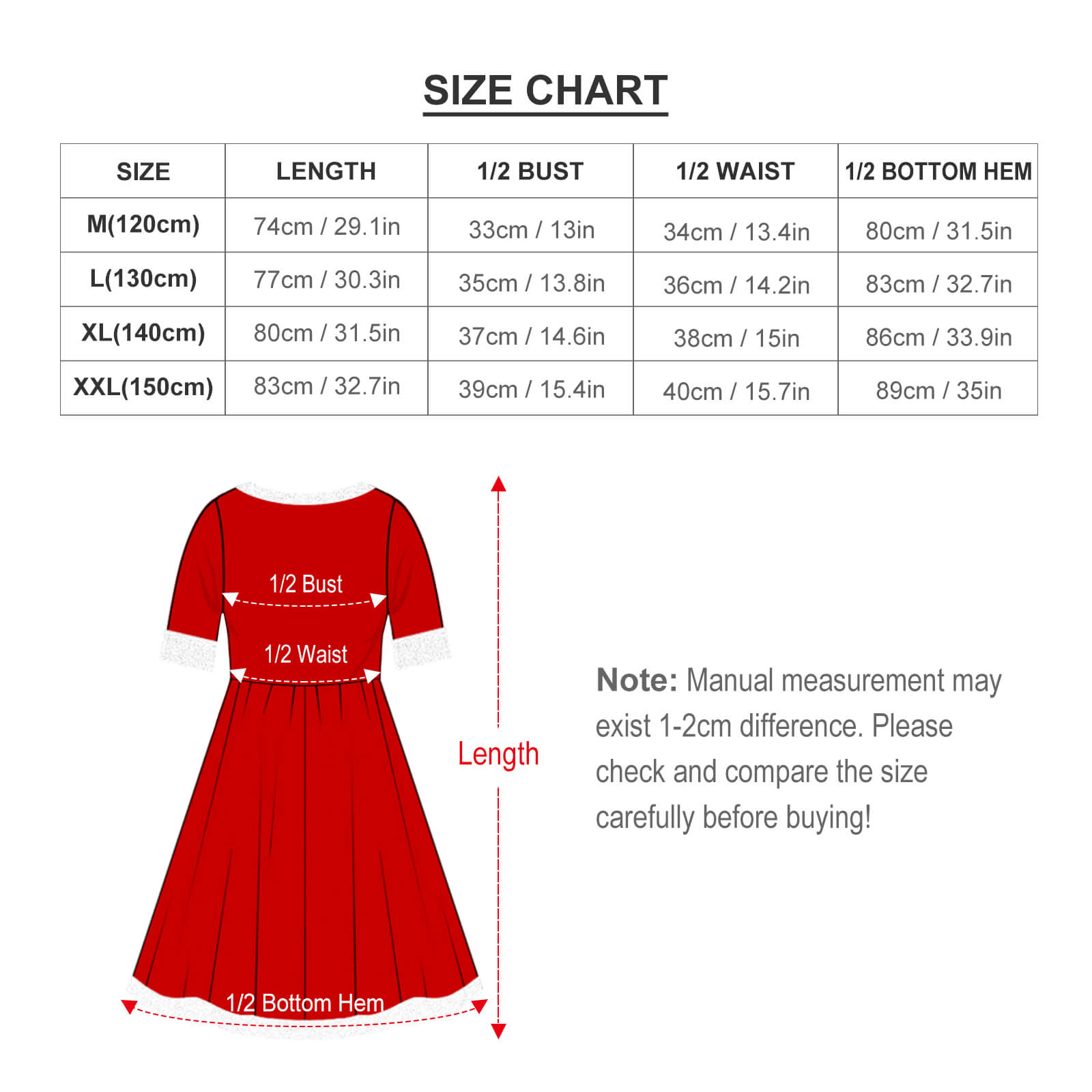 | Talla | Longitud(cm/in) | 1/2Busto(cm/in) | 1/2Cintura(cm/in) | 1/2Dobladillo(cm/in) |
